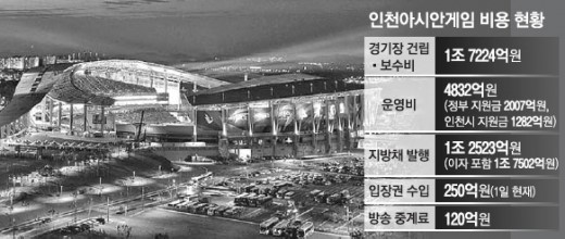 폐막을 이틀 앞둔 인천아시안게임이 적자를 기록할 게 확실시됨에 따라 대회가 끝난 뒤 후유증이 상당할 것으로 예상된다. 대회 수입이 전체 투입비용에 턱없이 미치지 못하는 데다 대회 종료 뒤 인천시가 갚아야 할 부채 원금만 1조원이 넘기 때문이다.