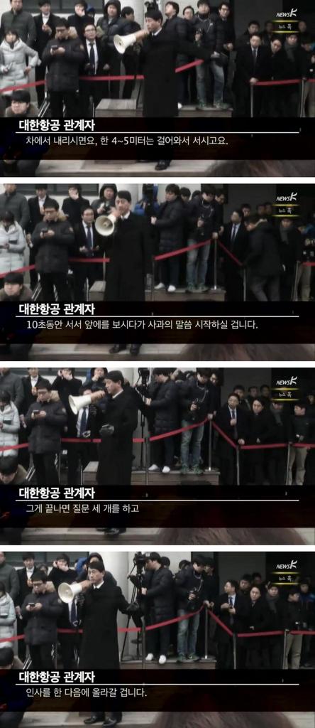 국토부에 조사받으러 가기 전 잠시 사과하는 자리에서 조현아 부사장이 도착하기전에 대한항공 관계자들이 리허설하는 장면...